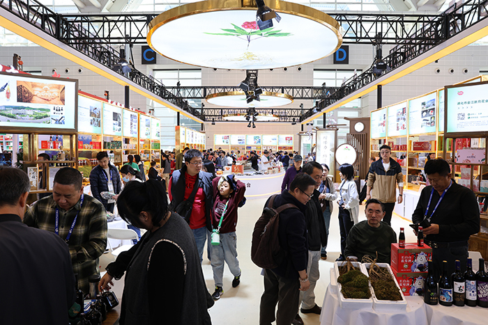 在天津国际会展中心,300平方米的吉林展馆以野山参为标志一袭“丰收金”盛装亮相,精心设计的展示空间极具视觉冲击力,成为展会中最引人注目的亮点之一。展区特别设置现场品鉴区,吉林小冰麦粉面包、燕麦面条、人参鲜椒酱、人参浸膏、葡萄酒等特色产品,吸引了众多采购商、参展商及消费者驻足品鉴。