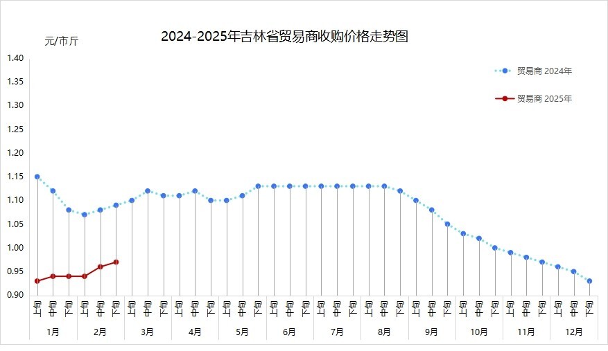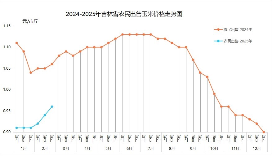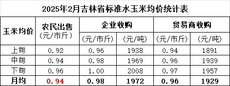 2月,贸易商和加工企业玉米收购价格均上调,农民出售玉米价格随之明显上涨。据玉米主产县益农信息社和12316热线平台不完全数据统计,农民出售标准水玉米月均价(元/市斤,下同)为0.94(农民出售自然水玉米价格多数在0.70-0.99之间不等),环比上涨0.03、提高3.3%,同比下降0.12、降低11.3%。全省各地区农民坐家出售标准水玉米价格为:长春90-0.99,吉林0.82-0.99,四平0.90-1.02,松原0.89-1.00,白城0.90-0.99,通化0.90-1.00,辽源0.88-0.99,延边州0.86-0.97,白山0.81-0.97。