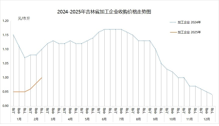 2月,我省加工企业玉米收购价明显上调,每吨上调60-90元。省内5家加工企业三等标准水玉米月均收购价(元/吨,下同)为1972,环比上涨66、提高3.5%,同比下降203、降低9.3%。2月28日,各大加工企业三等标准水玉米收购价分别为:中粮公主岭2050,松原嘉吉生化和四平新天龙2030,中粮榆树和吉林燃料乙醇1980。