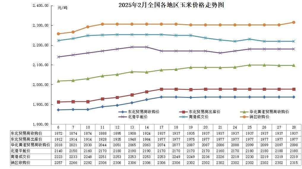 2月,国内玉米价格以上涨为主导。东北地区节后基层售粮进度较快,农民手中余粮低于往年,加工企业库存消耗加快,贸易商玉米外销情况好转,玉米价格上涨明显;北港玉米集港量较少,港口贸易商购销逐步活跃,玉米价格以上涨为主旋律;南港内贸库存增加,外贸库存减少,玉米价格先升后降;华北黄淮地区基层售粮进度同比偏快,贸易商加价增加库存,深加工企业提价吸引玉米上量,节后玉米价格一路提升;南方销区饲企对优质玉米存在补库需求,优质玉米价格上涨明显。