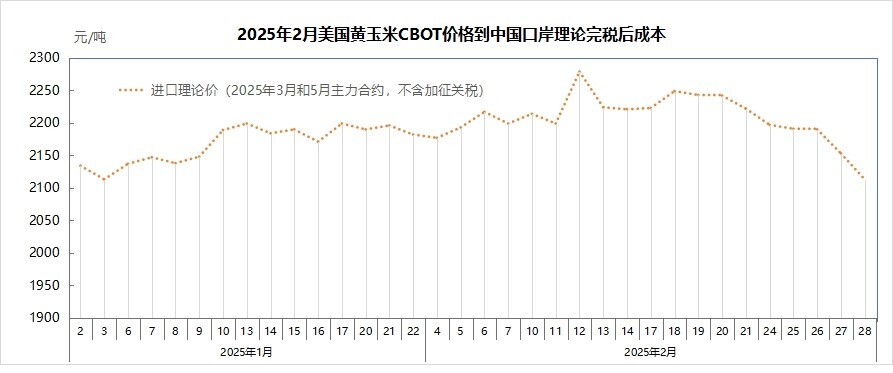 2月,每吨美国黄玉米cbot价格到中国口岸理论完税后成本(不含加征关税)为2113-2279元,进口价格整体先升后降,中旬进口价格上升幅度较大,主要是主力合约换月所致。1月,我国玉米进口量为10万吨,环比下降70.9%,同比下降97.2%。