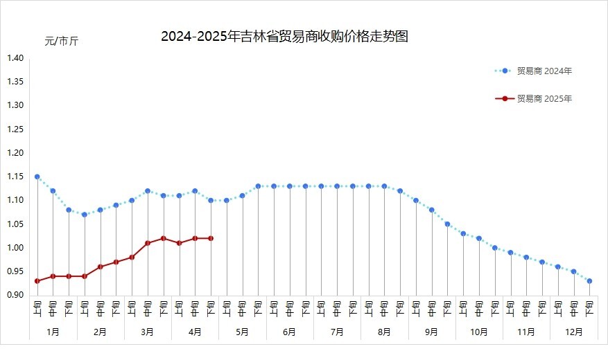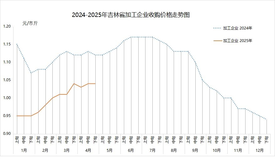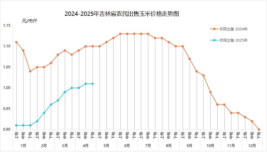 4月,基层玉米市场余粮较少,农民出售玉米价格整体上涨。据玉米主产县益农信息社和12316热线平台不完全数据统计,农民出售标准水玉米月均价(元/市斤,下同)为1.01(农民出售自然水玉米价格多数在0.86-1.10之间不等),环比上涨0.02、提高2.0%,同比下降0.09、降低8.2%。全省各地区农民坐家出售标准水玉米价格为:长春0.95-1.05,吉林0.90-1.04,四平0.99-1.05,松原0.93-1.03,白城0.92-1.03,通化0.95-1.05,辽源1.00-1.03,延边州0.94-1.03,白山0.93-1.02。