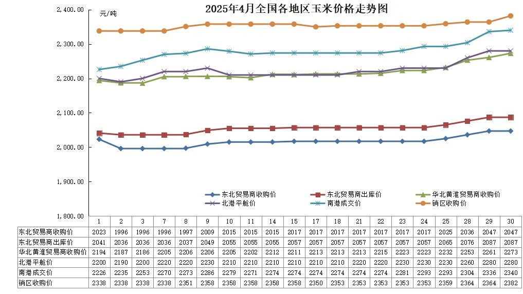 4月,国内玉米价格以上涨为主导。东北地区农户主要忙于春耕,下旬基层购销逐步停滞,贸易商挺价心态升温,玉米上量偏少,深加工企业因到货量减少而提价收购,玉米价格上涨;北方港口库存压力由大变小,加征关税支撑市场心态,玉米价格先降后升;南港进口谷物的替代优势下降,玉米价格上涨;华北黄淮地区贸易库存下降,加工企业到货量减少,玉米价格上涨;南方销区饲料企业内贸玉米需求提升,玉米价格稳中有涨。