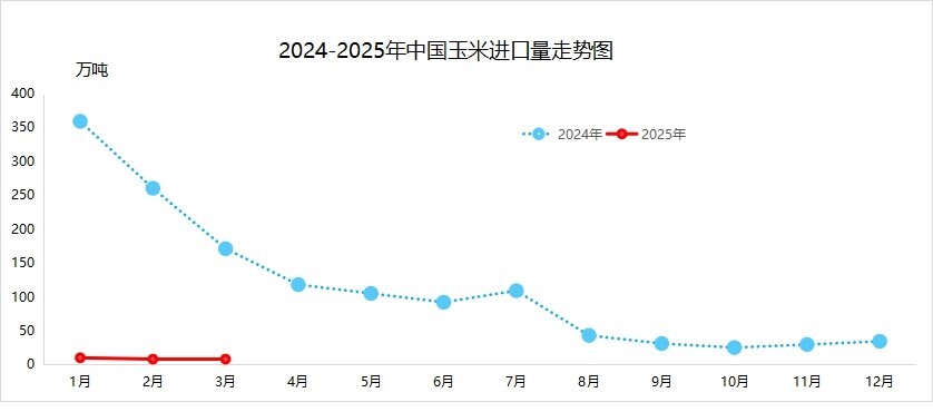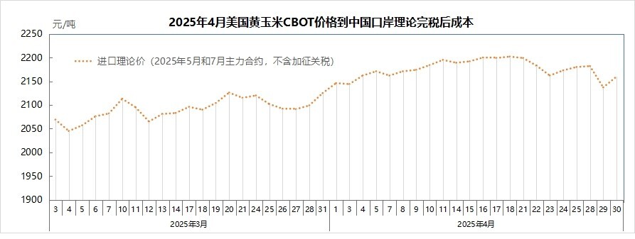 4月,每吨美国黄玉米cbot价格到中国口岸理论完税后成本(不含加征关税)为2137-2202元,进口价格重心整体上移。3月,我国玉米进口量为8万吨,环比持平,同比下降95.1%。1-3月,我国玉米累计进口量为26万吨,同比下降96.7%。