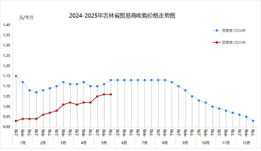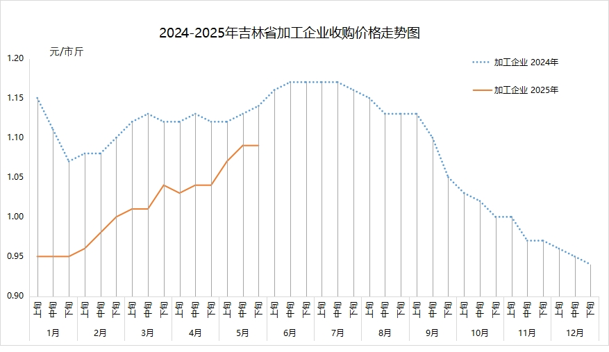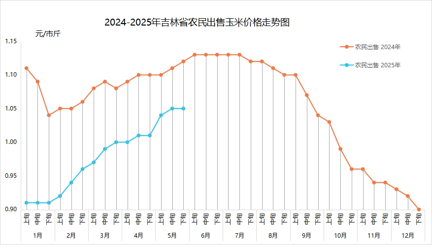 5月,基层玉米市场交易活动较少,农民出售玉米价格中上旬上涨、下旬维持稳定。据玉米主产县益农信息社和12316热线平台不完全数据统计,农民出售标准水玉米月均价(元/市斤,下同)为1.05(农民出售自然水玉米价格多数在0.96-1.10之间不等),环比上涨0.04、提高4.0%,同比下降0.06、降低5.4%。全省各地区农民坐家出售标准水玉米价格为:长春1.00-1.10,吉林0.97-1.08,四平1.01-1.07,松原1.00-1.07,白城1.00-1.07,通化0.95-1.07,辽源1.00-1.07,延边州0.99-1.05,白山0.95-1.02。