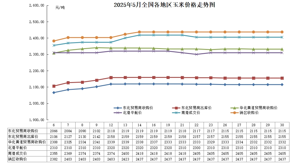 5月,国内玉米价格整体上涨后趋于平稳。东北地区处于春耕生产阶段,粮源多转移至中间环节,深加工企业库存消耗,陆续提价补库,玉米市场价格先涨后稳;北方港口到货量小幅增减,玉米价格波动不大;南港到货成本居高,玉米价格上涨;华北黄淮地区流通粮源下降,加工企业厂门到货量较低,企业收购积极,玉米价格上涨后小幅波动;南方销区饲料企业部分需求转向内贸玉米,玉米价格上涨后保持平稳态势。