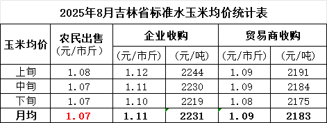 8月,我省部分加工企业玉米收购价格下调,下调幅度为5-70元/吨。省内5家加工企业三等标准水玉米月均收购价(元/吨,下同)为2231,环比下降19、降低0.9%,同比下降56、降低2.4%。8月29日,各大加工企业三等标准水玉米收购价分别为:四平天成2260,松原嘉吉生化2180,吉林燃料乙醇2160,中粮公主岭和中粮榆树停收。