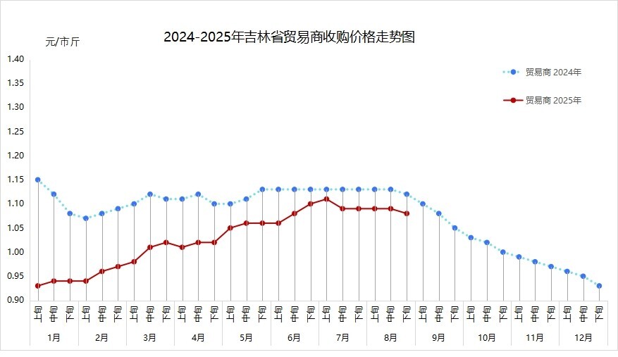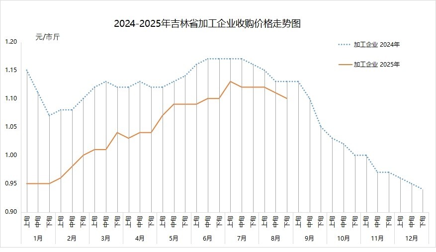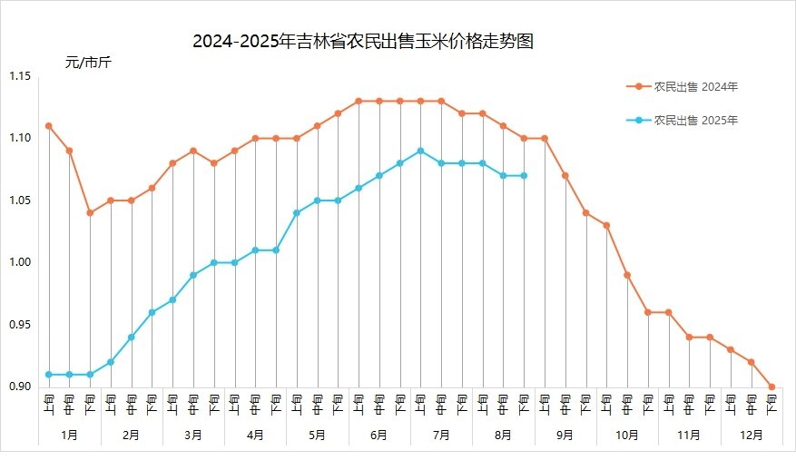 8月,基层农户手中余粮见底,农民出售玉米价格下降。据玉米主产县益农信息社和12316热线平台不完全数据统计,农民出售标准水玉米月均价(元/市斤,下同)为1.07(农民出售自然水玉米价格多数在1.04-1.15之间不等),环比下降0.01、降低0.9%,同比下降0.04、降低3.6%。全省各地区农民坐家出售标准水玉米价格为:长春1.06-1.10,吉林1.05-1.09,四平1.07-1.11,松原1.06-1.09,白城1.05-1.09,通化1.06-1.09,辽源1.05-1.09,延边州1.05-1.08,白山1.05-1.07。