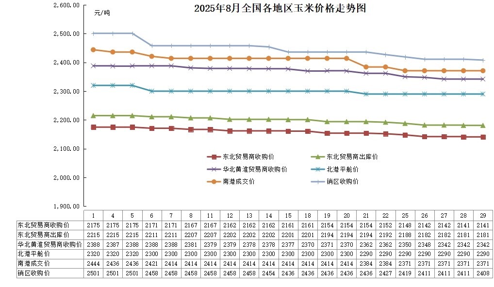 8月,国内玉米价格整体下降。东北地区贸易商挺价心态减弱、出货意愿提升,部分深加工企业停产检修、库存基本上能与新玉米衔接,玉米价格下降;北港集港量低位,走货速度也明显放缓,玉米平舱价格下滑;南港受小麦到港压力影响,去库存速度也放缓,玉米价格下跌;华北黄淮地区春玉米上市,贸易商出粮速度加快,玉米价格下降;南方销区饲料企业玉米采购热情下降,大规模补库动力不足,玉米成交价格走势下行。
