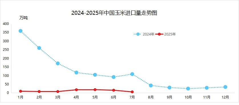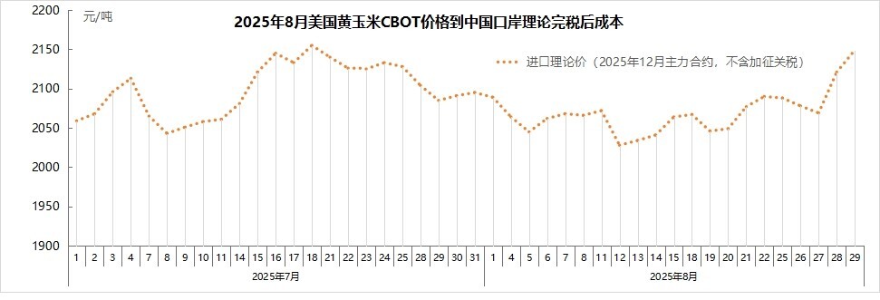 8月,每吨美国黄玉米cbot价格到中国口岸理论完税后成本(不含加征关税)为2028-2149元,进口价格走势整体小幅波动。7月,我国玉米进口量为6万吨,环比下降64.4%,同比下降94.9%。1-7月,我国玉米累计进口量为84万吨,同比下降93.0%。