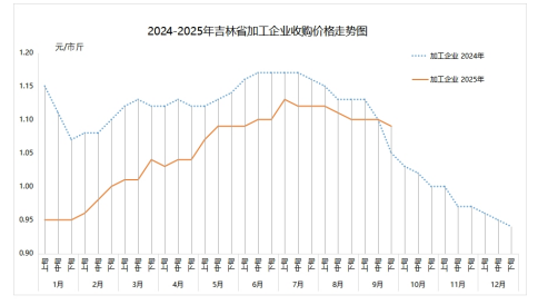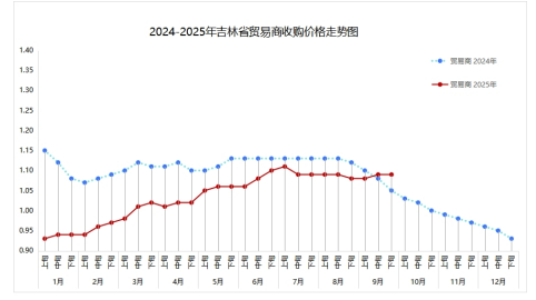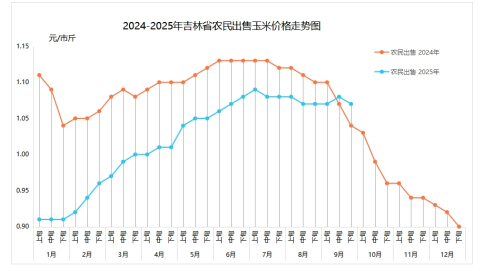 9月,基层农户手中陈粮所剩无几,月末农户主要忙于秋收,少量收割机粒子出售,农民出售玉米价格先涨后降。据玉米主产县益农信息社和12316热线平台不完全数据统计,农民出售标准水玉米月均价(元/市斤,下同)为1.07(农民出售自然水玉米价格多数在1.04-1.15之间不等),环比持平,同比持平。全省各地区农民坐家出售标准水玉米价格为:长春1.06-1.10,吉林1.05-1.08,四平1.06-1.12,松原1.06-1.10,白城1.05-1.09,通化1.06-1.09,辽源1.05-1.09,延边州1.05-1.08,白山1.05-1.07。