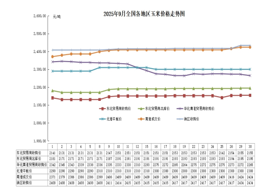 9月,国内玉米价格涨跌互现。东北地区贸易商陈粮库存相对有限,玉米价格相对坚挺,新粮少量上市,加工企业新玉米价格高开后走低;北港受低库存和新粮少量上市的影响,玉米平舱价格小幅波动;南港低库存,受北港成本支撑和双节饲企采购影响,玉米价格上涨;华北黄淮地区新粮上市量增加,东北陈玉米持续流入,市场供应相对充足,玉米价格下降;南方销区饲料企业整体需求不佳,但双节前短期补库促进玉米成交价格小幅上涨。