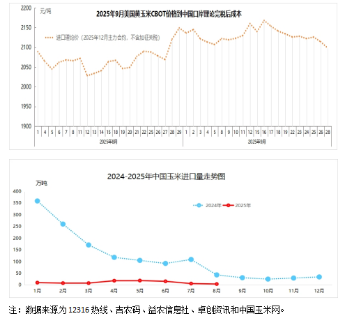 9月,每吨美国黄玉米cbot价格到中国口岸理论完税后成本(不含加征关税)为2098-2168元,玉米进口价格重心上移。8月,我国玉米进口量为3.6万吨,环比下降35.2%,同比下降90.5%。1-8月,我国玉米累计进口量为88万吨,同比下降93.0%。