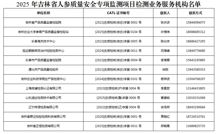 现将2025年吉林省人参质量安全专项监测检测业务服务机构名单予以公告。