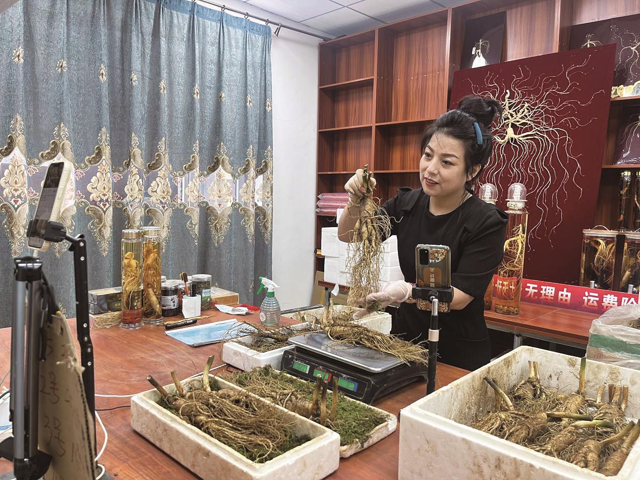 在快大人参交易市场,人参商户电商拓市场。本报记者 何禹洁 摄