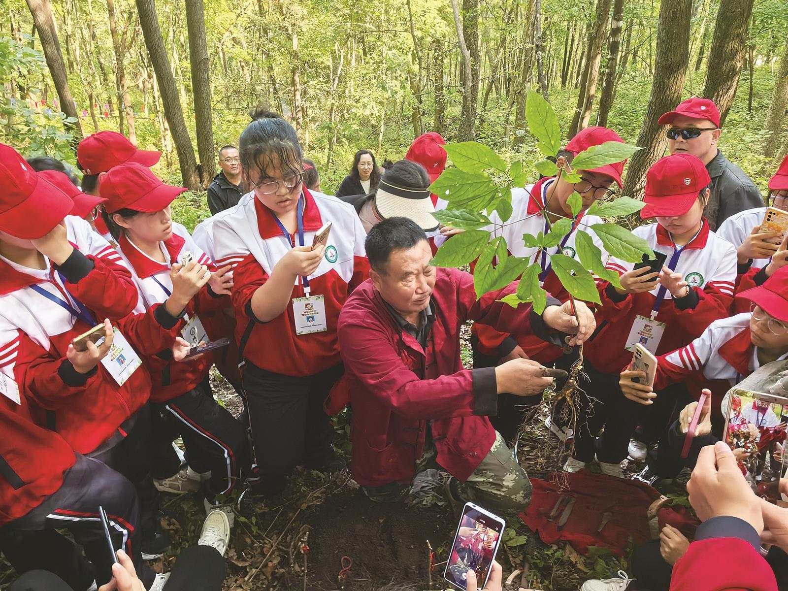 在云岭野山参保护区,“参把头”带领研学游学生采挖人参。企业供图