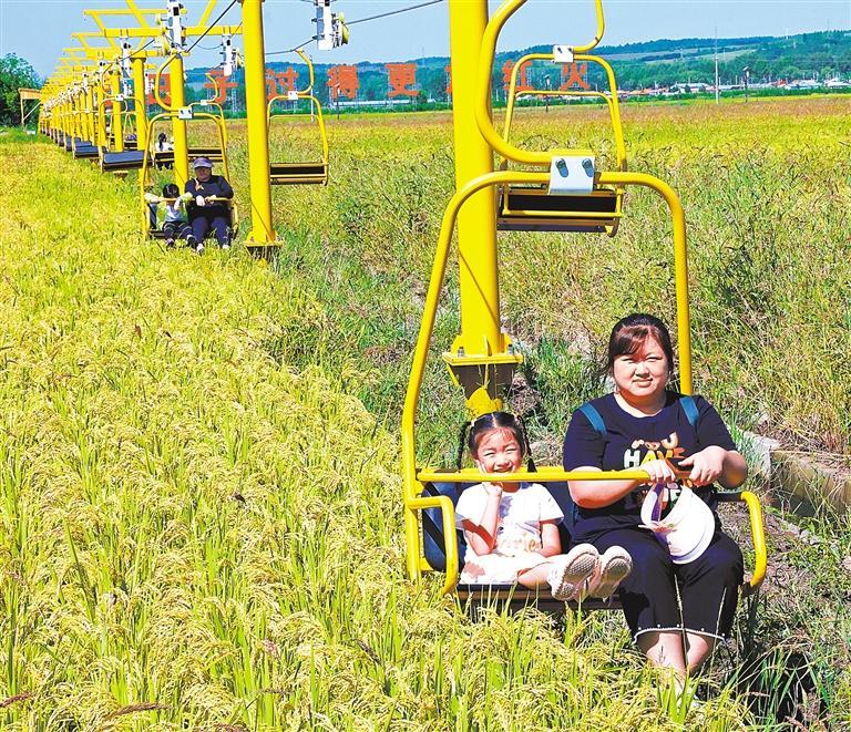 9月7日,游客在光东村乘坐低空缆车穿行于稻田间。稻田亲子乐园、稻田小火车、螃蟹乐园等游玩项目与稻田融为一体,吸引游客前来体验田园生活。