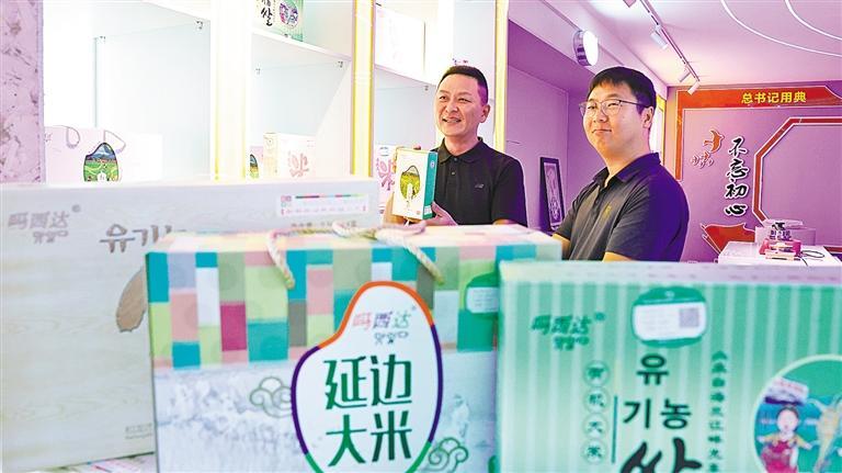 9月7日,光东村吗西达有机米业展厅,总经理金君(左)向顾客介绍大米产品。“吗西达”在朝鲜语中意为“美味”。2024年,该公司销售有机大米1300多吨,带动光东村及周边400多户村民增收。