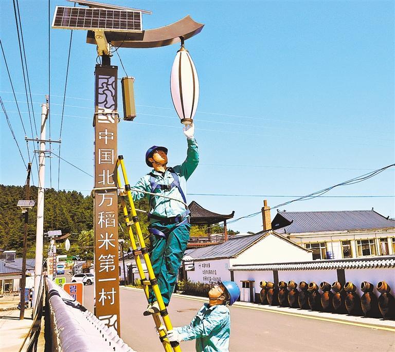 9月7日,国网吉林电力延边供电公司员工在光东村维修路边照明设施。国网延边供电公司成立了9支志愿服务队,为村民安全用电及粮食春播、夏灌、秋收、销售提供“一站式”供电增值服务。