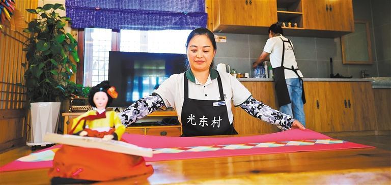 9月7日,光东村稻花香民宿,员工在打扫房间。光东村整合村内闲置房屋,建成60个不同主题风格的特色民宿,发展旅游产业的同时,也带动了周边2000多户村民就业。